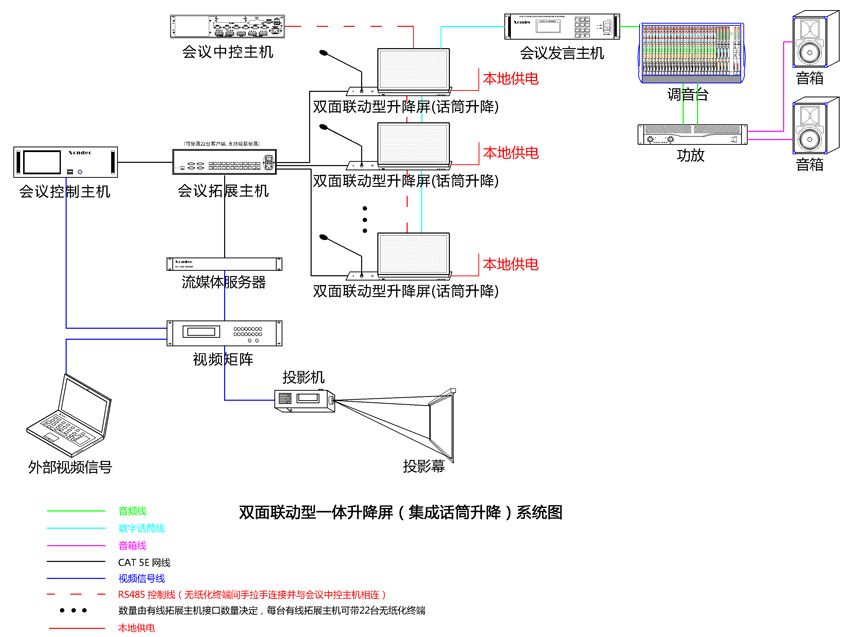 3、系統(tǒng)可以擴展第三方網(wǎng)絡中控,從而實現(xiàn)任意會議終端(經(jīng)過授權)隨時對周邊設備進行控制;第三方中控可通過RF/RS 485協(xié)議對升降進行統(tǒng)一控制。